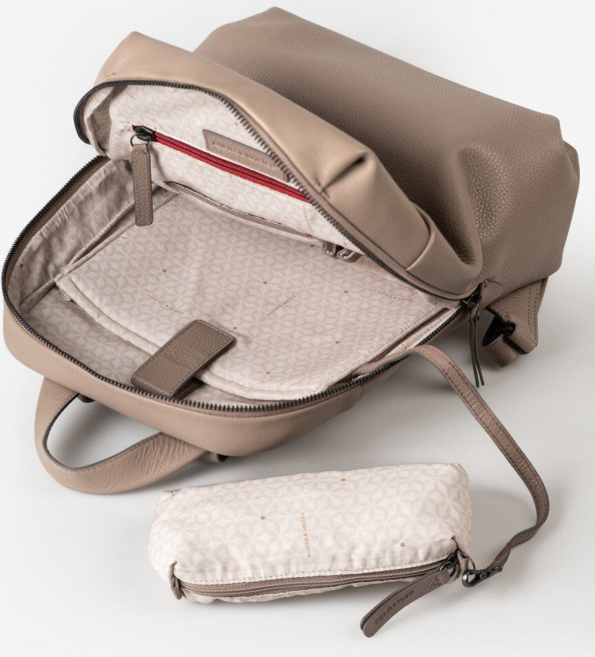 Charm ist ein geräumiger Rucksack mit praktischem, umlaufendem Zwei-Zipper-Reißverschluss, dessen Kombination aus Glatt- und genarbtem Leder ihm eine luxuriöse Note verleiht. Er bietet Platz für alles, was in Freizeit und Beruf nicht fehlen darf. Verschiedene Einsteckmöglichkeiten, ein Schlüsselband und ein herausnehmbares Extra-Täschchen sorgen für Klarheit und Übersicht. Dinge, die du gern schnell griffbereit hast, lassen sich im rückseitigen Reißverschlussfach unterbringen, das über eine extra Zipper-Sicherung verfügt. Für dein Tablet ist ein spezielles, gepolstertes Innenfach integriert.
