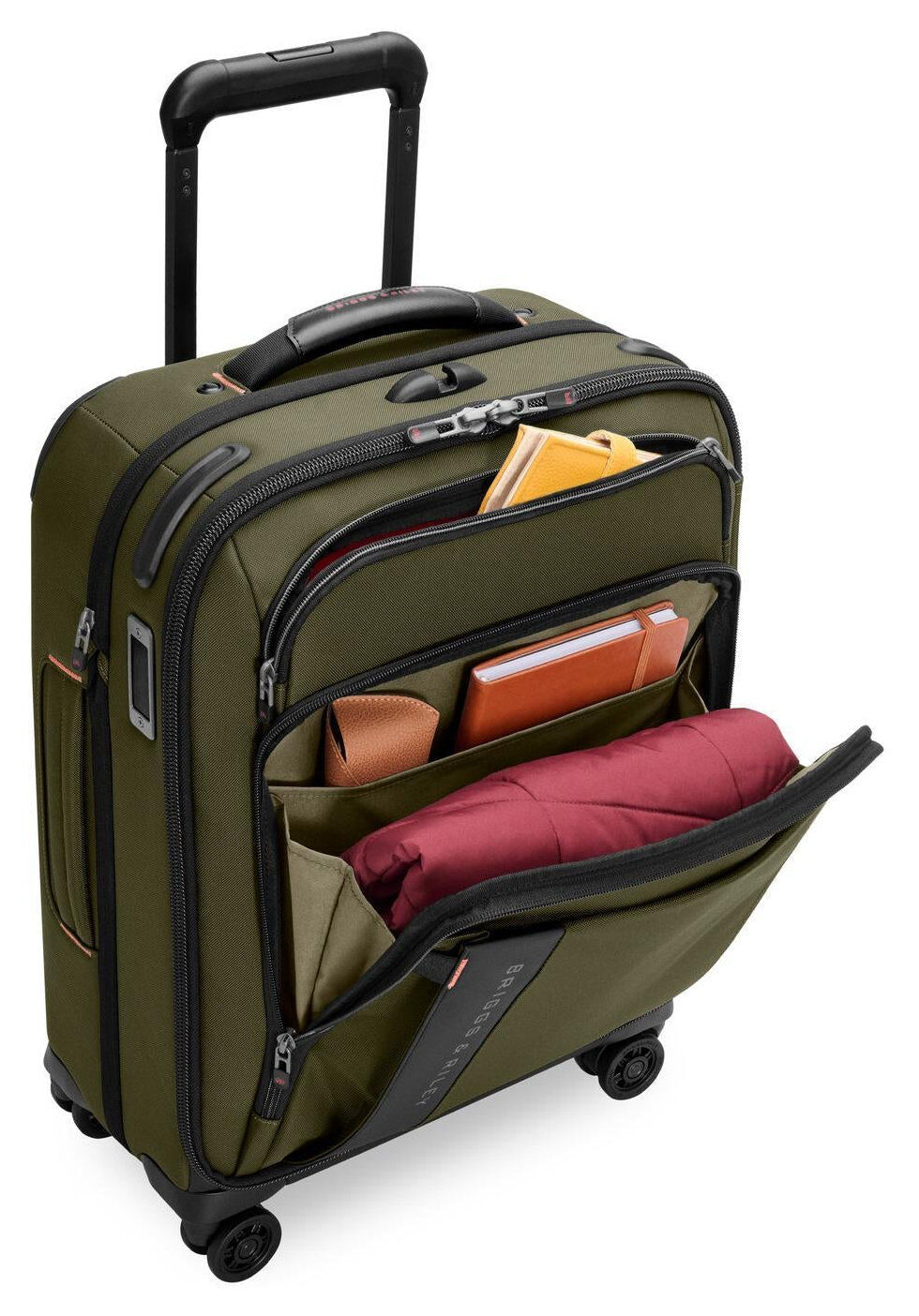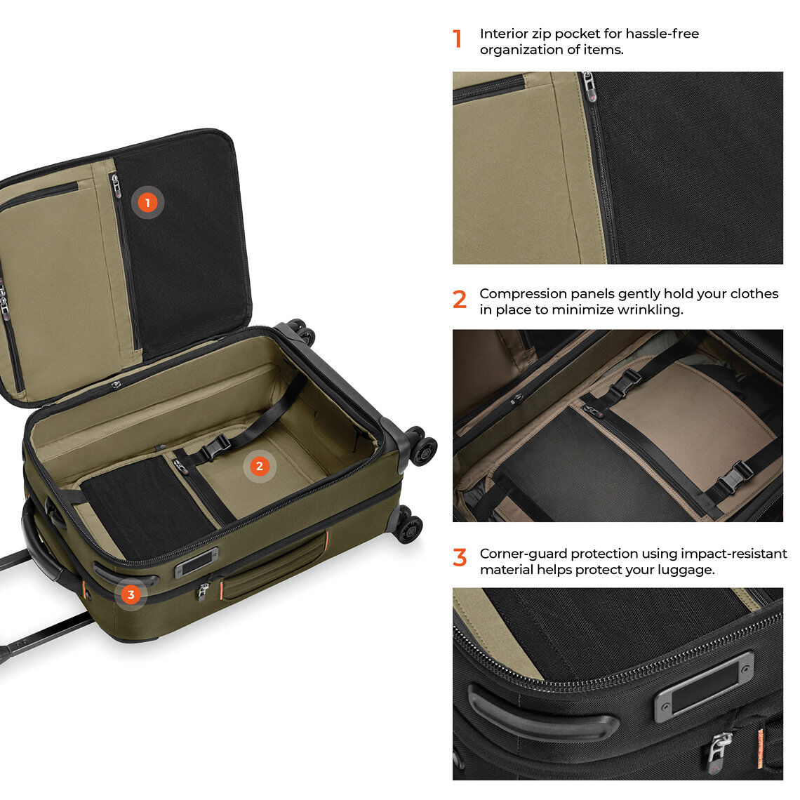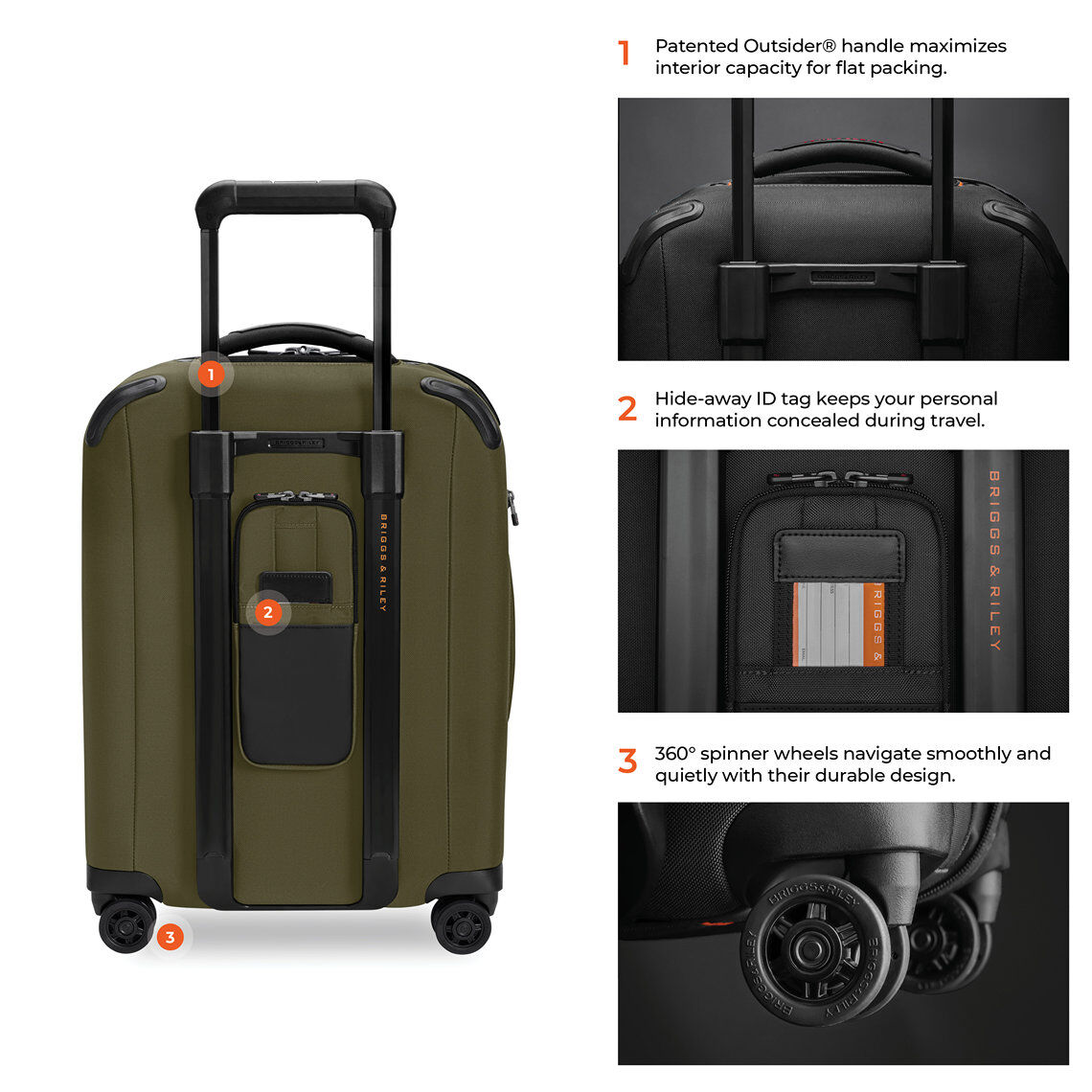 - Der patentierte und ikonische Outsider®-Griff maximiert den Innenraum und sorgt für eine flache Packfläche zur Minimierung von Knitterfalten.