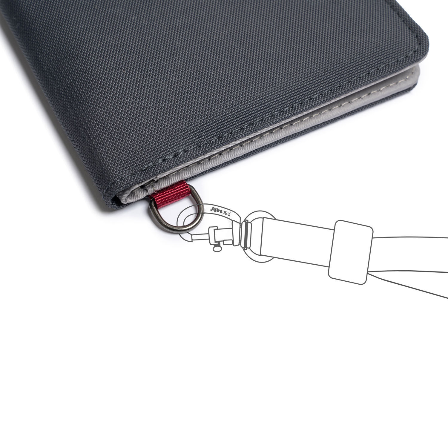 - Befestigungspunkt zur Anbringung an einer Pacsafe-Tasche