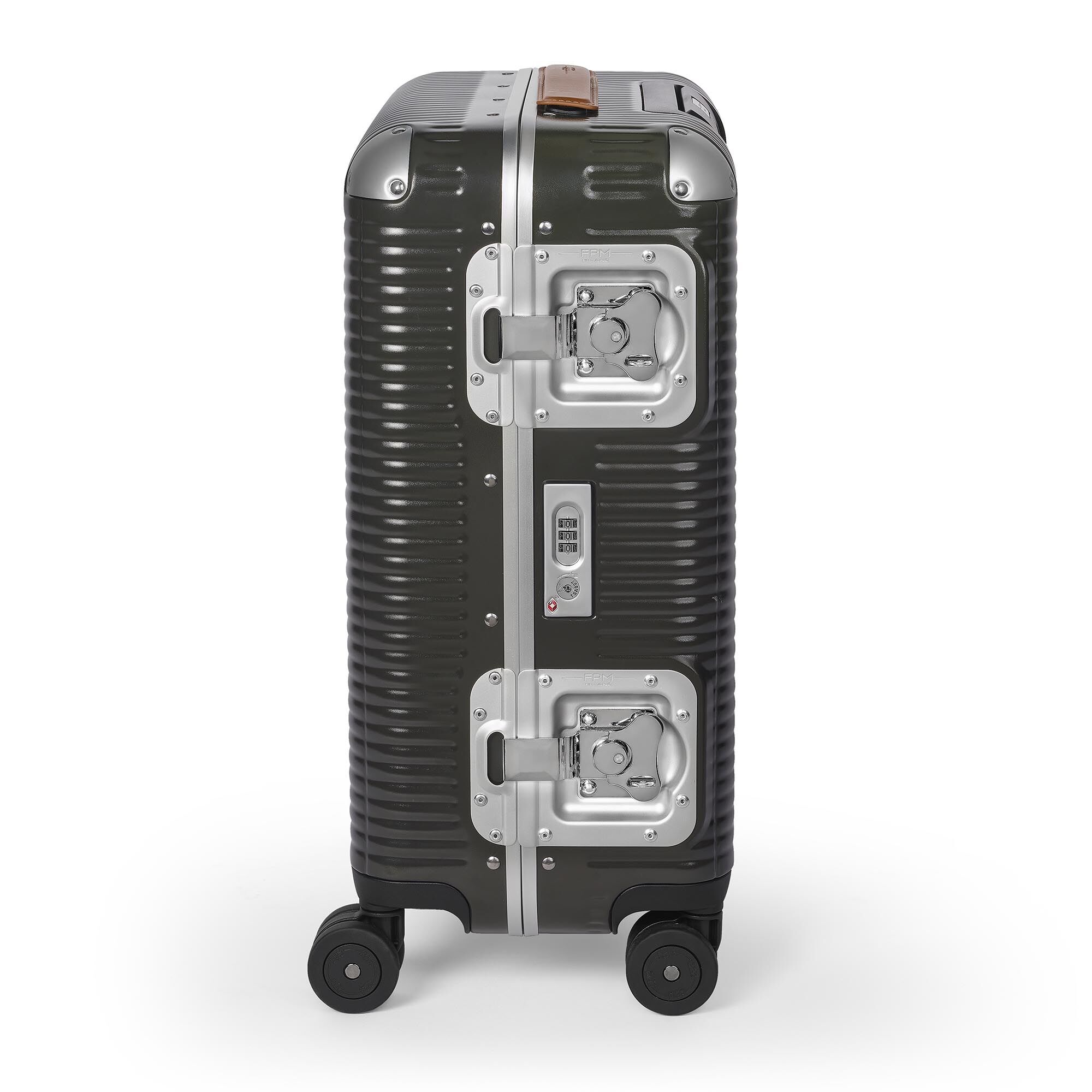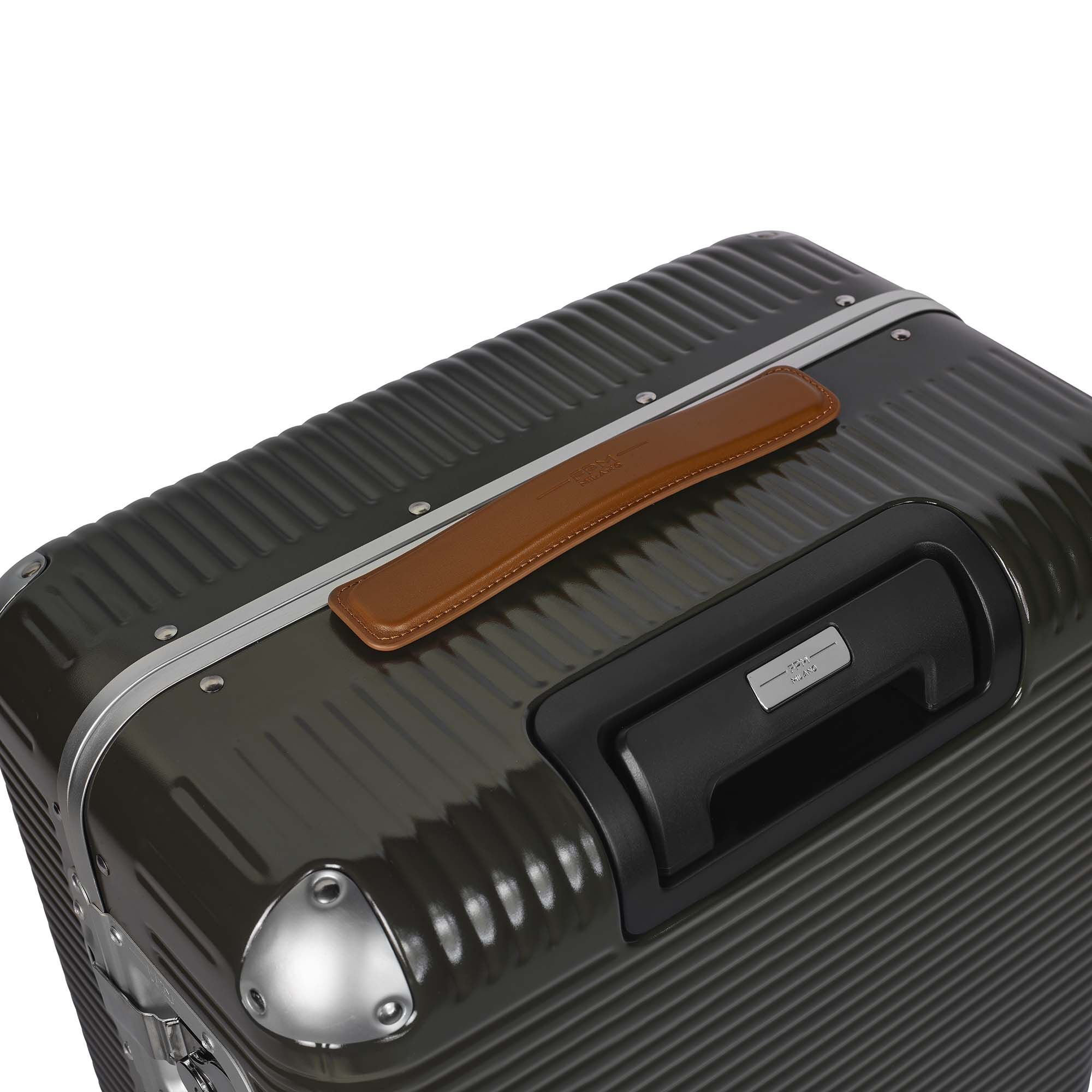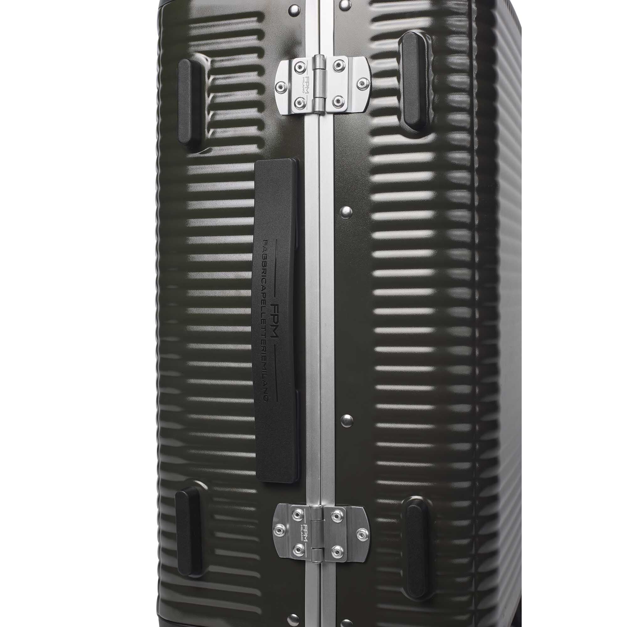 100% Makrolon -Polycarbonat. Koffer auf 4 Doppelrädern, superleise und gleitend, die für große Stabilität sorgen. Das Gepäck ist mit einem integrierten TSA-Schloss ausgestattet, ideal für kosmopolitische Reisende, die in die Vereinigten Staaten reisen. Zusätzliche Sicherheit bieten zwei Maxi-Schmetterlingsschlösser. Die beiden Griffe sind aus feinem italienischen Leder gefertigt und mit dem FPM-Logo graviert. Die Innenseite besteht aus herausnehmbarem Futter und ist mit Gummibändern und Nickelclips versehen, die es Ihnen ermöglichen, den Inhalt zu organisieren. Das Modell ist ideal für Reisen von 2-3 Tagen.