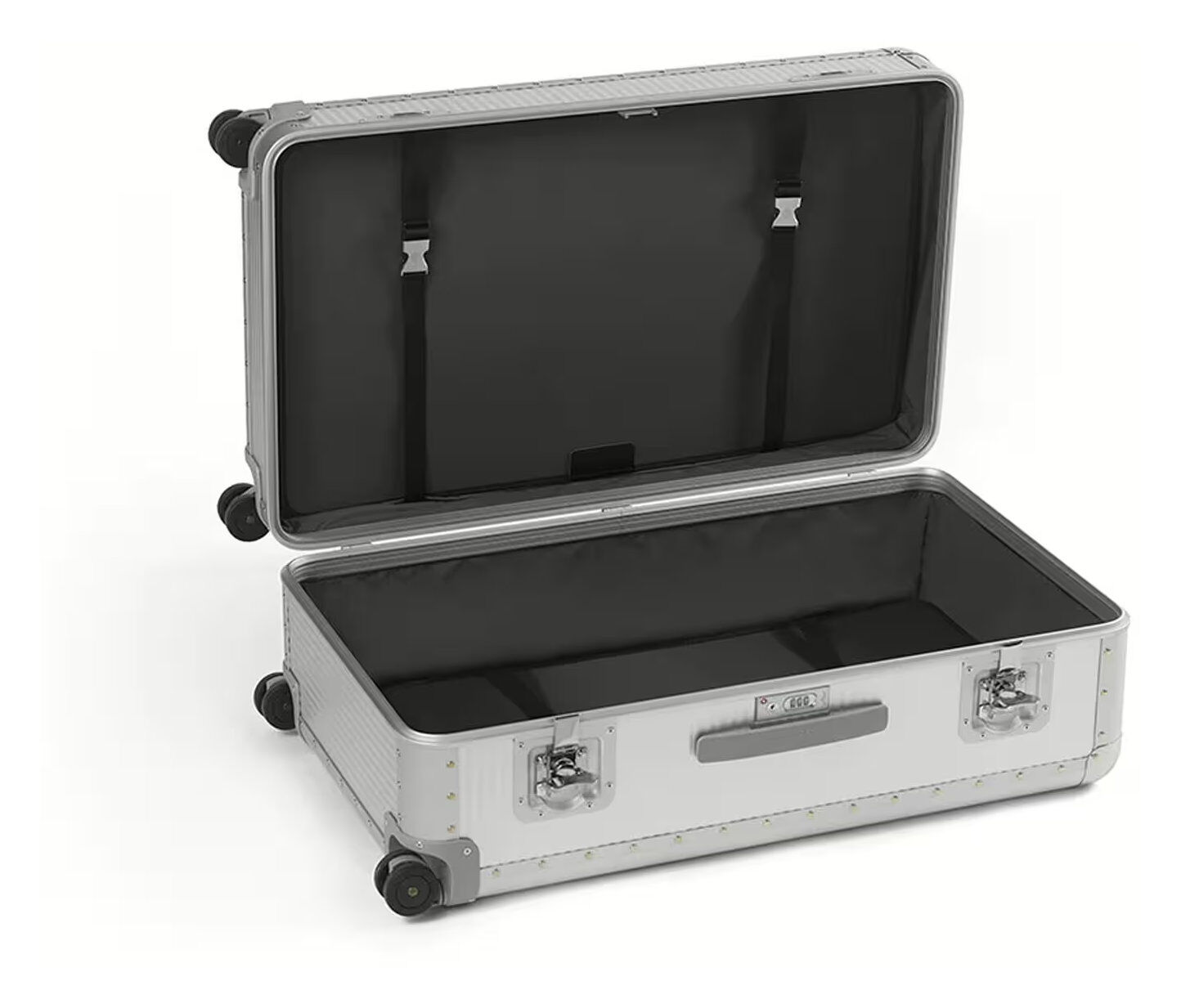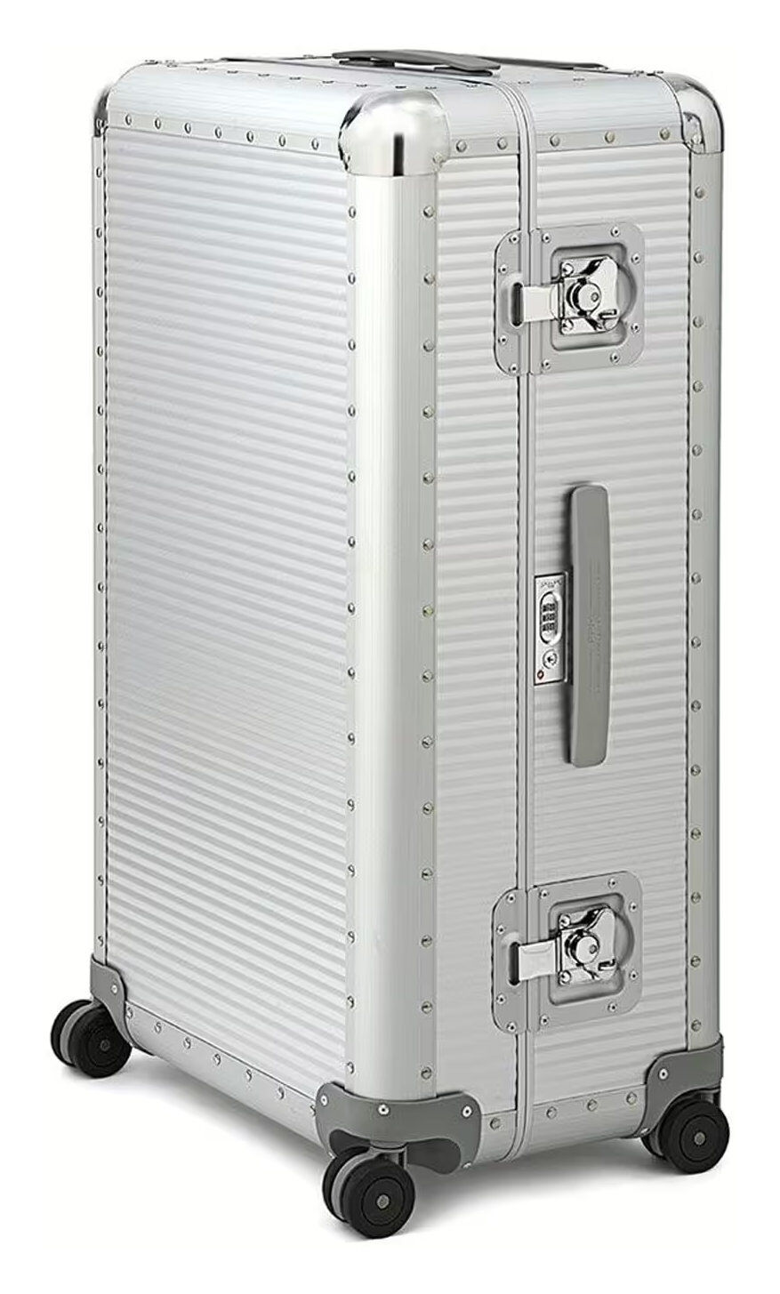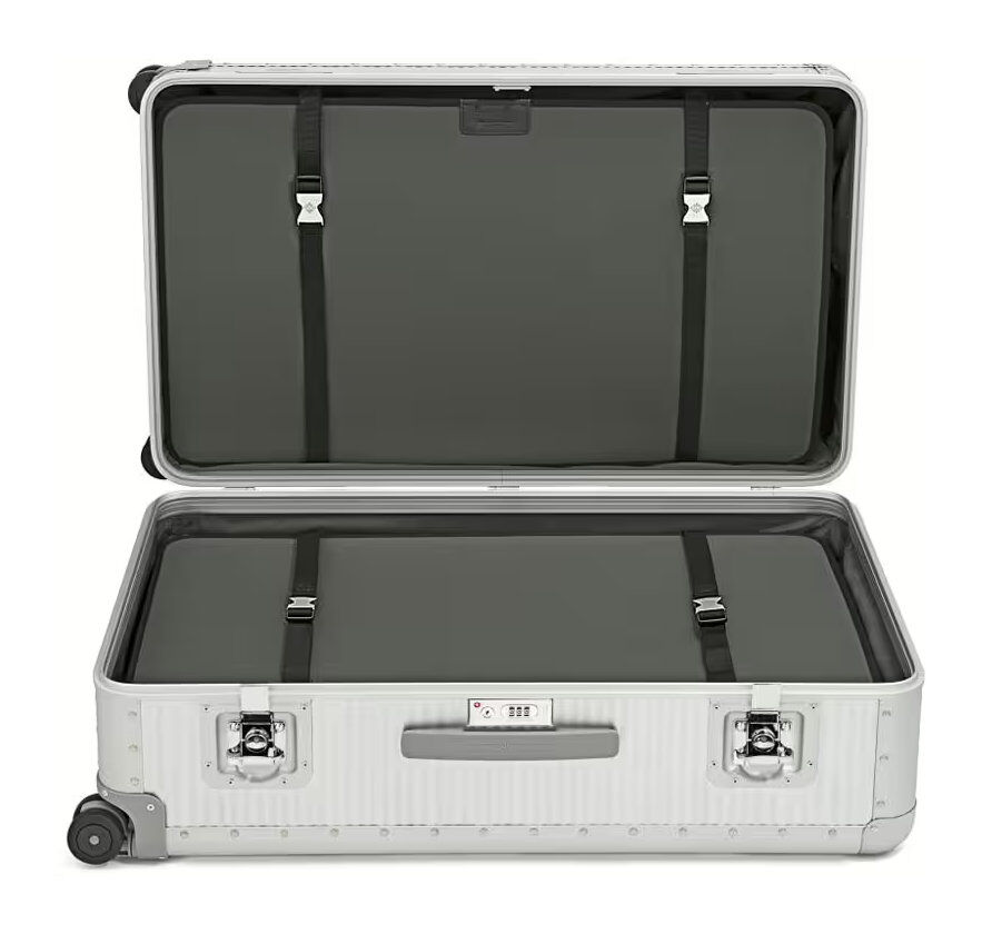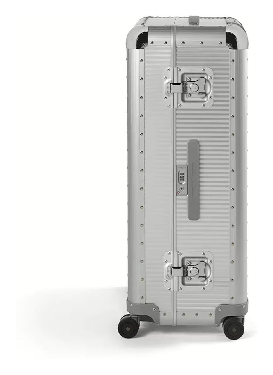 Bank S ist eine sportliche und dynamische Version der Kollektion. Die griffigen Griffe erleichtern das Anheben des Koffers und die Doppelrollen ermöglichen einen mühelosen und reibungslosen Transport. Die sorgfältige Beachtung interner Details zusammen mit den 10 Mikron (μ) dicken Aluminiumschalen und den Butterfly-Schlössern verleihen der Kollektion den unverwechselbaren Bank-Stil.