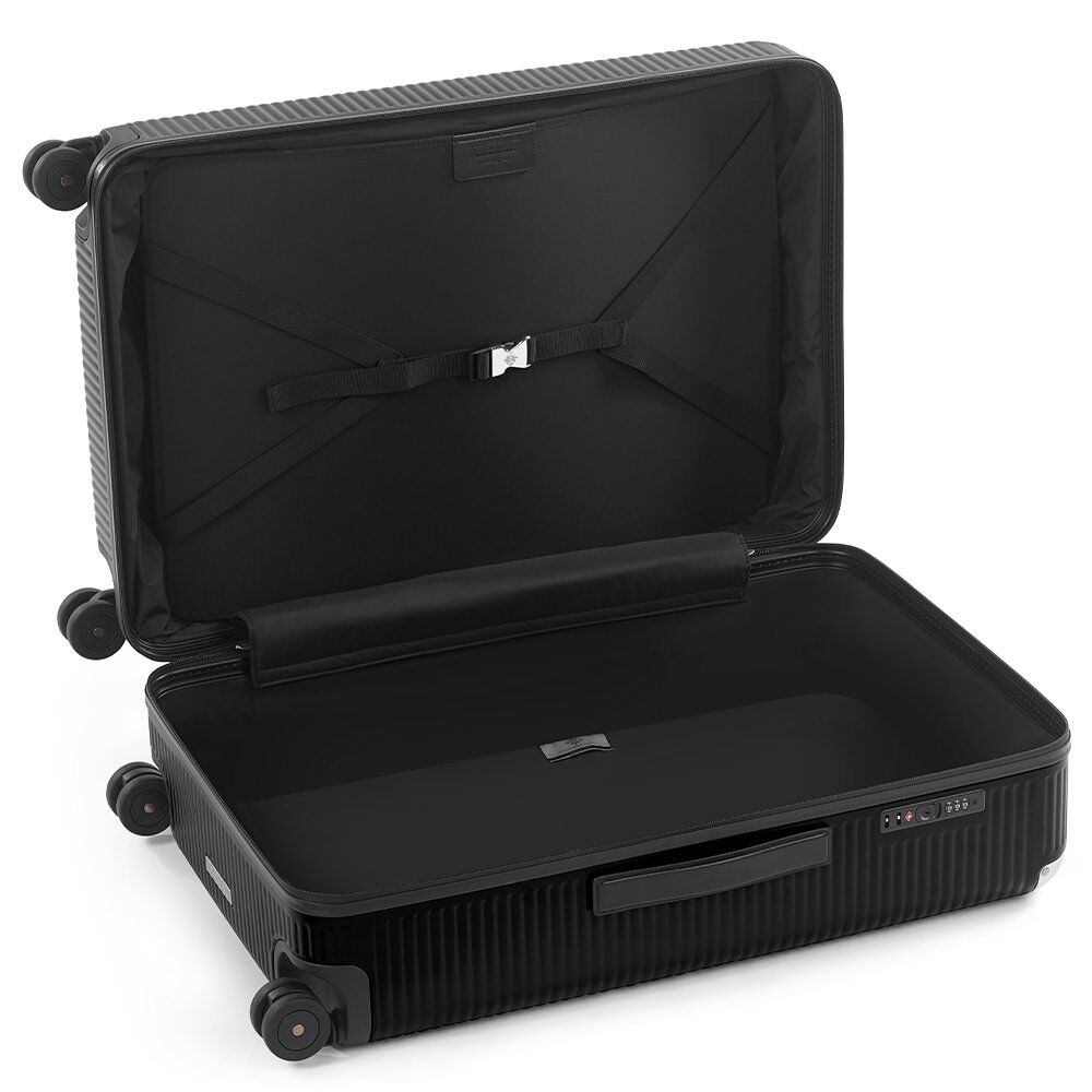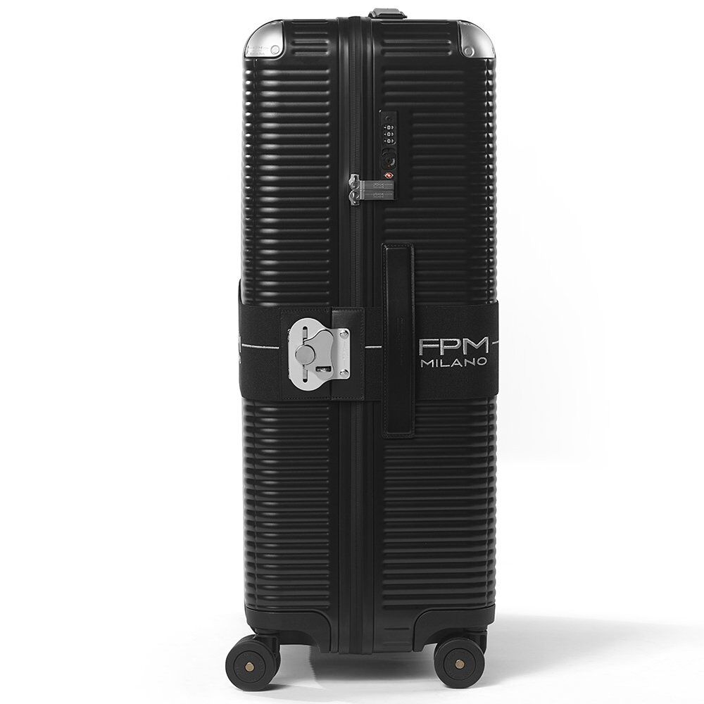 Die Kollektion Bank Zip Deluxe aus Polycarbonat, hergestellt in Italien, besticht durch Leichtigkeit und Funktionalität und zeichnet sich durch ihren Reißverschluss aus. Das elastische Band mit gesticktem Logo wird mit dem ikonischen Aluminium-Butterfly-Verschluss geschlossen – dem unverkennbaren Markenzeichen der Marke. Ledergriffe, Aluminiumecken und vier Doppelrollen garantieren Leichtläufigkeit.