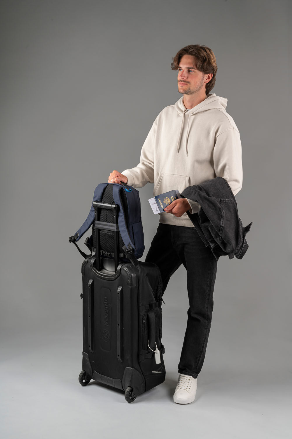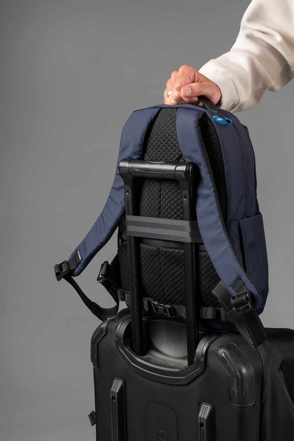 - Gepäckschlaufe, die über den Griffen des Gepäcks gleitet, um Ihre Tasche auf Ihrem Rollgepäck auszubalancieren