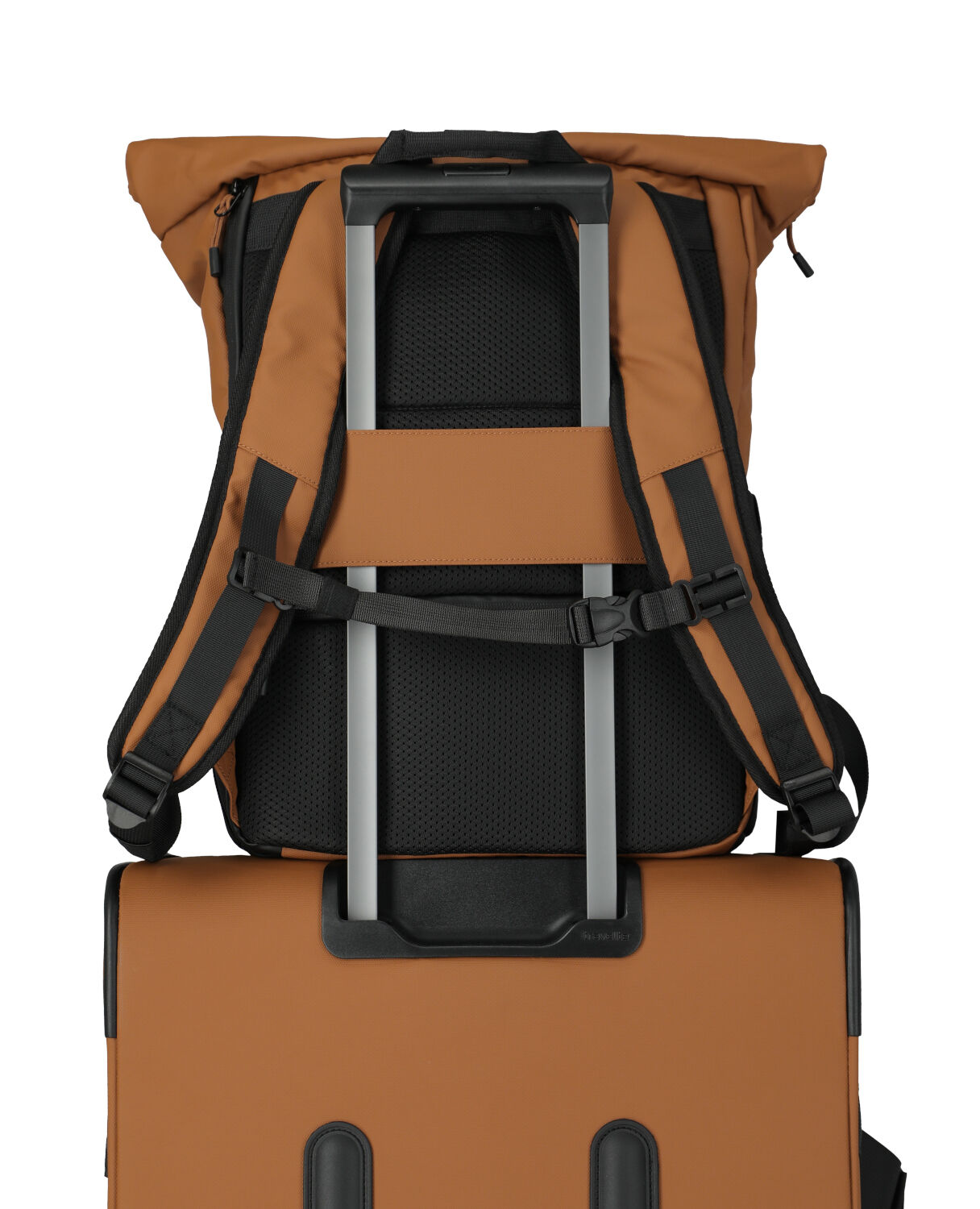 Der Trolley Backpack ist aus wasserabweisendem Planenmaterial. Wie das Reisewetter auch wird: Der Inhalt bleibt trocken.