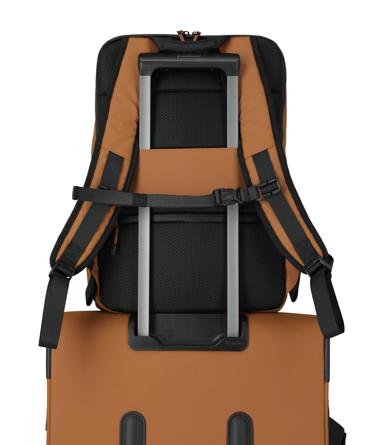 Einfach auf Reisen mit Trolley kombinierbar. Mit der Lasche auf der Rückseite des Rucksacks, kann dieser einfach auf einem Gestänge platziert werden.