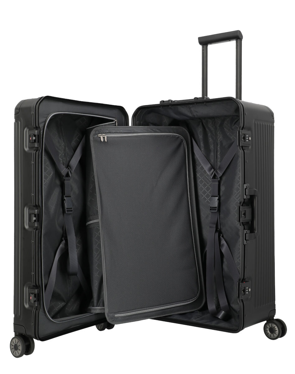 Dieser praktische Koffer aus widerstandsfähigem Aluminium hat ein besonderes Trunk Format, welches sogar sperrige Dinge, wie Skischuhe oder Kamera Equipment, sicher verstaut. Neben vier Doppelrollen für maximale Stabilität und höchsten Komfort, erhält das Aluminium mit jeder Reise eine einzigartige Patina.
